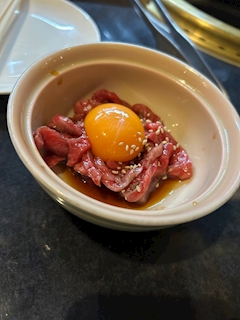 ユッケらぶ> ·̫ q🎀♩ 卵崩したあとに写真撮るの忘れてて慌ててすぐ撮った( ᴖ ̫ᴖ )汗 ユッケってなんでこんなに美味しいんだろう🥺🫶🏻 ユッケが美味しい焼肉屋さんは何食べても美味しい説꒰՞ɞ̴̶̷̥⩊ɞ̴̶̷̥꒱֯ また焼肉いきたいにゃ🥺💖 今週ラストがんばる!
